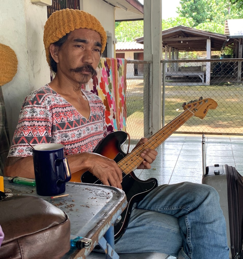 That night I found myself in front of a Buddhist temple. A calm place for my veins pumped full of cortisol. I was shown to a covered sleeping area by Monk Mitya. There I introduced myself to Uten who came home late from his gig as a blues musician. Uten is a middle aged Thai man of small stature and quick wit. Perhaps due to his time spent living at the temple his pride was well within reason. He laughs easily and often. Also, he was a hot pink car. Cool guy.